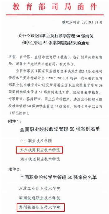 On July 23, the Ministry issued the Notice on the Publication of the Result of Top 50 Teaching Management Cases and Top 50 Student Management Cases Among Nation-wide Vocational Colleges and Universities (JZCSH (2019) No. 78) and our college was the only one college ranking as Top 50 Teaching Management Cases and Top 50 Student Management Cases Among the Nation-wide Vocation Colleges and Universities, which marks the affirmation and recognition of the Ministry of Education for the establishment of a perfect management system and quality assurance and supervision mechanism and the improvement of technology and skill talent cultivation quality by the school.