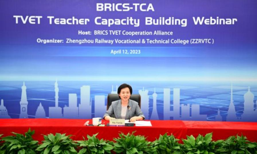 On April 12th, the First “TVET Teacher Capacity Building Webinar” in 2023, hosted by the Secretariat of the BRICS TVET Cooperation Alliance and the China Education Association for International Exchange, and organized by ZZRVTC, was held. More than 200 institutional representatives, professional teachers and enterprise leaders from alliance members engaged in an in-depth exchange of views on “course development and talent cultivation in the context of industry-education integration”. The meeting was held in English, and Ma Yuxia, President of ZZRVTC, chaired the meeting in English. The meeting was also attended by Vice President Li Fusheng and relevant department heads.