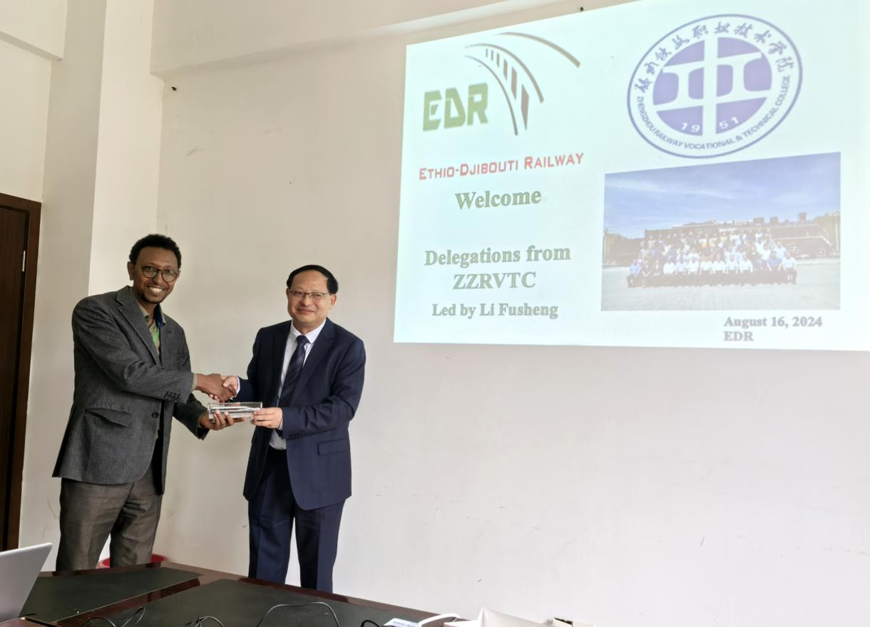 In the morning, Li Fusheng and his delegation met with Samuel Biru Zeberga, Director of Capacity Building at EDR, Mebratu Delelegn Endalemaw, Operations Director, Daniel Hailemichael Workofa, Technical Director, and Yang Anwei, Executive General Manager of the Addis Ababa-Djibouti Railway Operation and Maintenance Project, and Song Zhen Gang, Director of Capacity Building. Li Fusheng introduced the College's overall development in recent years, focusing on its international education, international vocational education standards, and resource development, as well as its practices and effectiveness in going global with enterprises to cultivate local railway technical and skilled talents for the Belt and Road initiative, especially in training employees for the Addis Ababa-Djibouti Railway and implementing the cooperation memorandum signed by both parties. Samuel, the Director of Capacity Building, expressed his gratitude for the College's strong support in capacity building and introduced the construction process and significance of the Addis Ababa-Djibouti Railway, its operational status, and the 12 capacity-building tasks for the trainees. After the meeting, both parties expressed their commitment to working together on subsequent cooperation to contribute more to the healthy and sustainable operation and development of the Addis Ababa-Djibouti Railway.