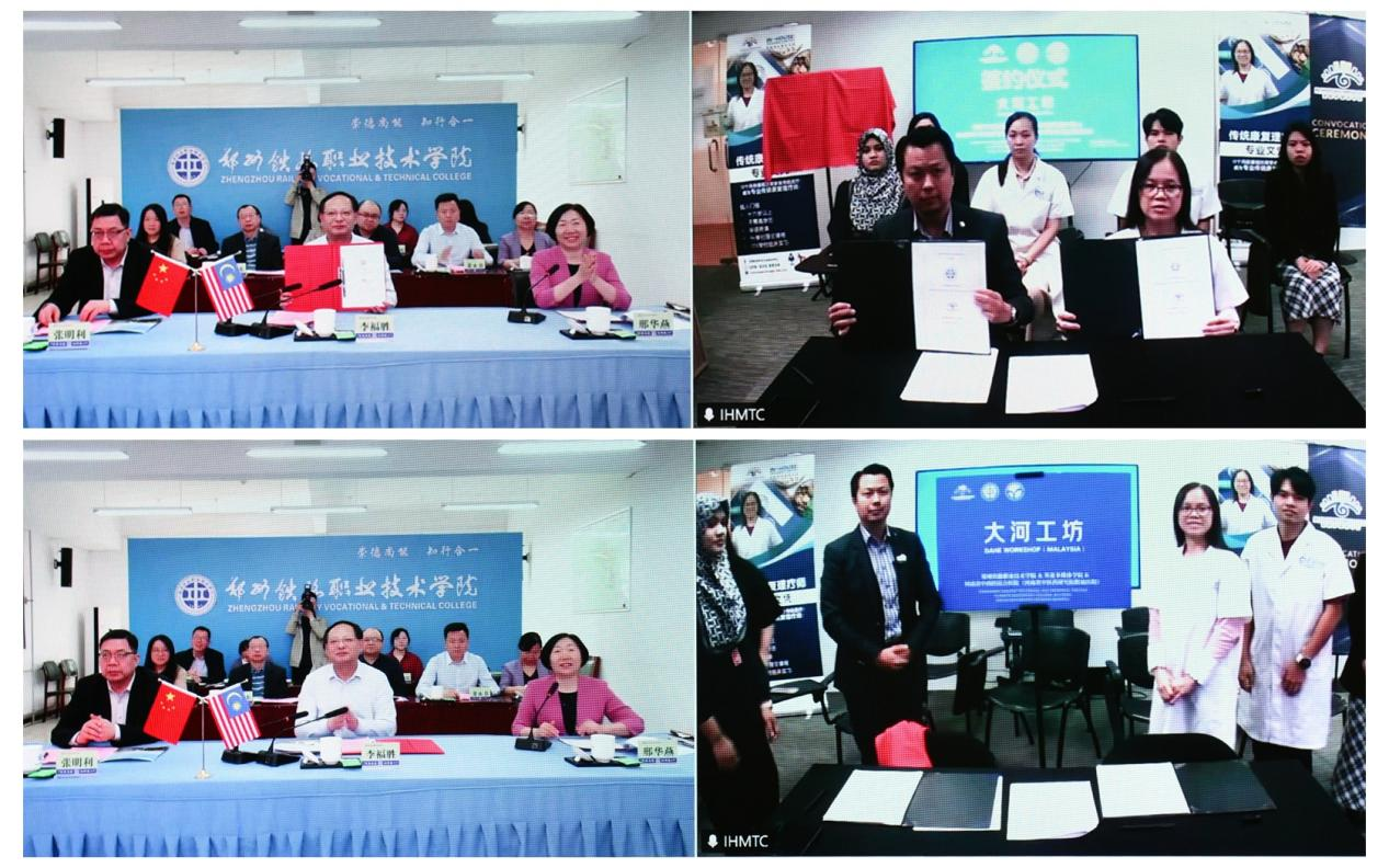 During the event, ZZRVTC, In-house Multimedia College, and Henan Integrative Medicine Hospital respectively signed the cooperation agreement for the TCM skills training program and jointly unveiled Dahe Workshop in Malaysia.