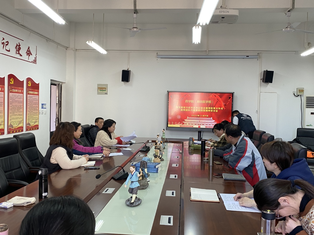 为深入学习领会习近平总书记重要回信精神,2021年11月9日下午,药学院(基础医学部)在3203会议室召开学习贯彻习近平总书记给全国高校黄大年式教师团队代表重要回信精神研讨会,全院教师参会。