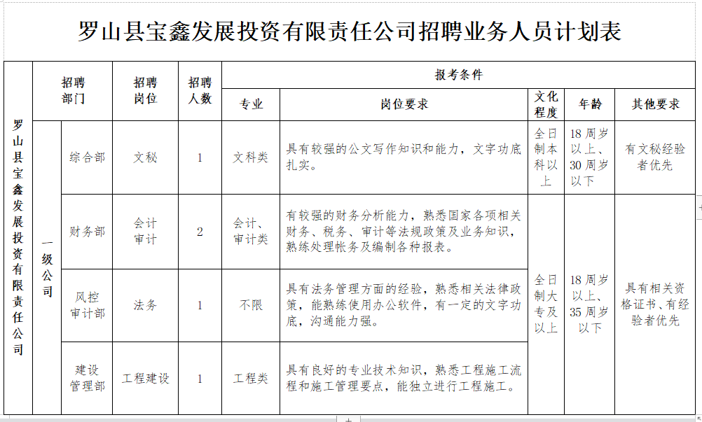 罗山县宝鑫发展投资有限责任公司因工作需要,经县投融资中心审核并报县政府批准,现面向社会公开招聘业务人员5名(详见《罗山县宝鑫发展投资有限责任公司招聘业务人员计划表》),现将有关事项公告如下: