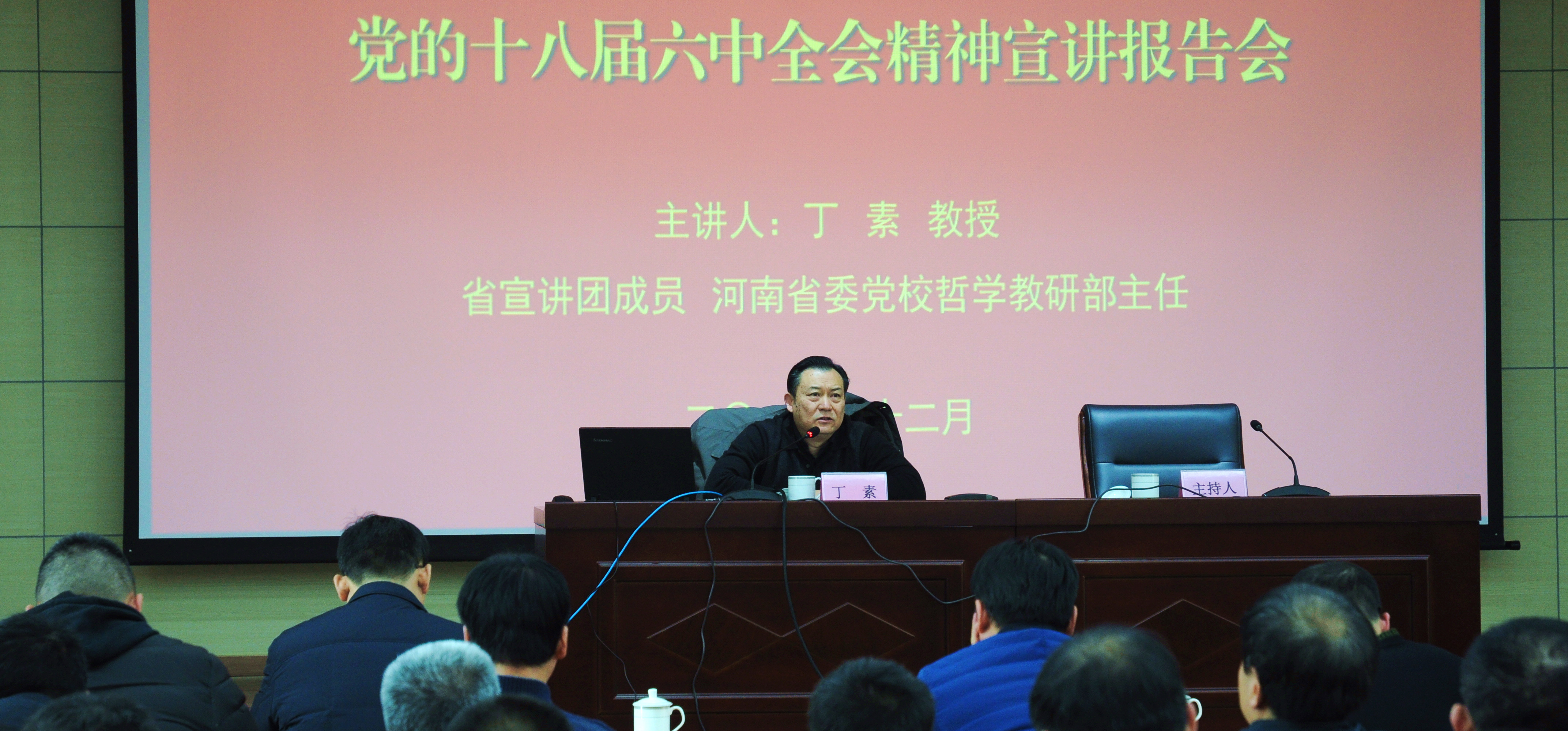 12月1日,我校邀请省宣讲团成员、河南省委党校哲学教研部主任丁素教授到校作专题报告,宣讲党的十八届六中全会精神。报告会由校党委副书记、纪委书记谢乾主持。在校的校领导,全体科级以上干部以及各党支部书记参加报告会。
