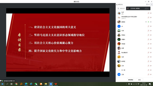 3月26日,运输管理学院党总支与郑州地铁集团运营分公司客运三中心党委开展主题党日党建联建活动,特邀请我校党的二十大精神宣讲团成员崔琬茹老师以线上形式开展“建设社会主义文化强国”主题宣讲,双方党员共50余人参加。